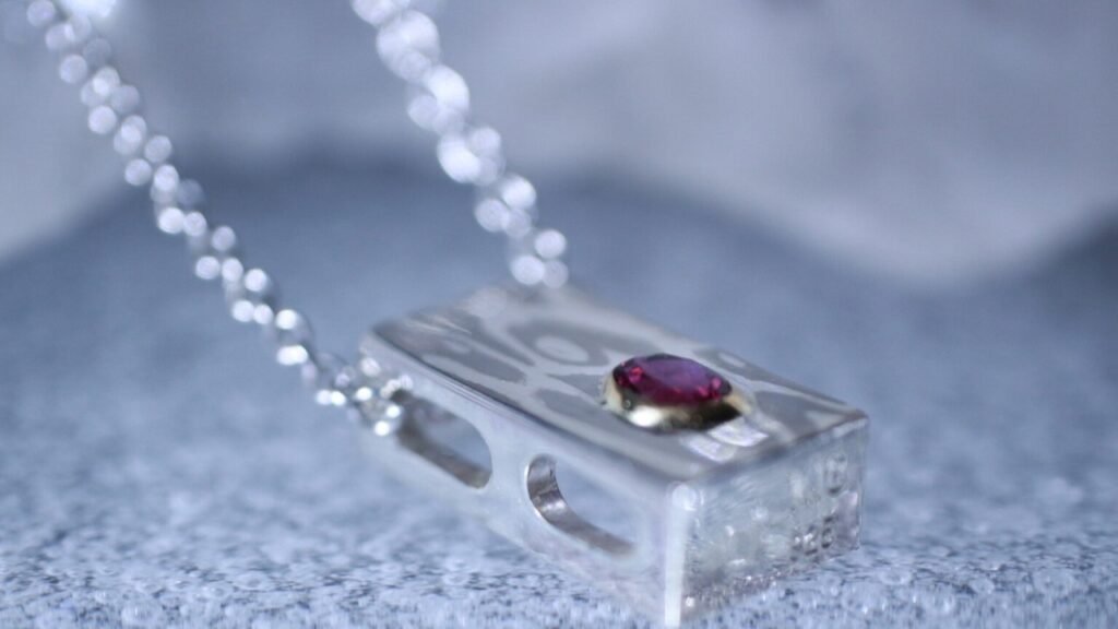 日本の伝統技法「木目金(もくめがね)」で繊細な模様を描き、ルビーの周りをK18で上品に縁取ったこのペンダントは、他にはない美しさ。